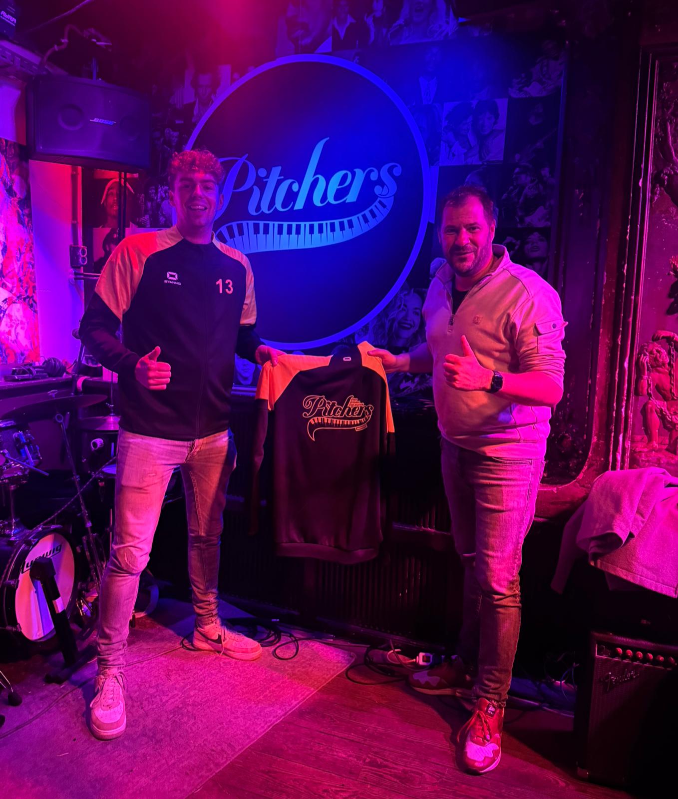 Alweer wat langer zijn de mannen van Heren 2 vaste gast bij Cafe Pitchers in Amersfoort. Die bezoeken hadden alweer even geleden een leuk effect: eigenaar Vincent van Brakel bleek bereid om Heren 2 te voorzien van nieuwe trainingspakken. De foto’s zeggen genoeg: samen met Vincent wordt een deel van de pakken getoond. Meteen maar een oproep aan de andere leden van onze vereniging: als je in Amersfoort bent kun je Cafe Pitchers vinden aan de Groenmarkt op nummer 7!